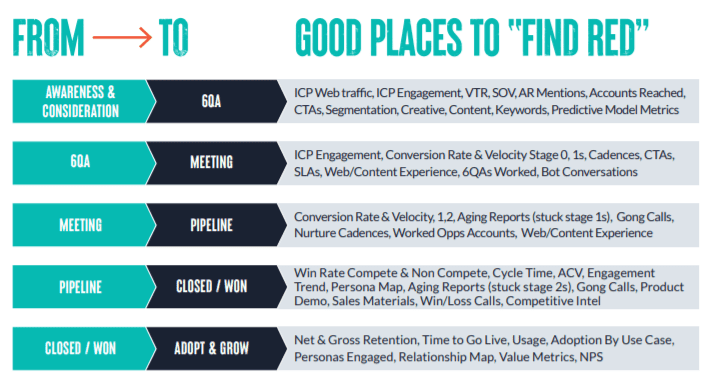 You can look at a bunch of different metrics and each funnel stage to find the red. Benchmarks are a great start but even better is looking at your own historical data and setting improvements on them.