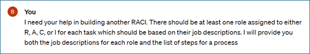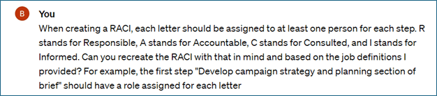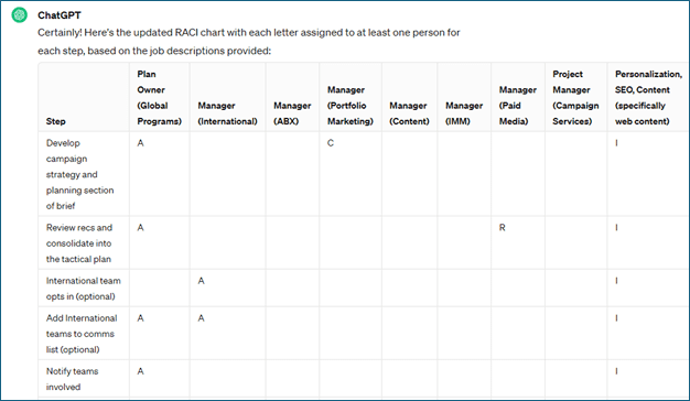 That’s not totally wrong and something else to keep in mind when using CGPT. It’s never going to be perfect, and I don’t necessarily have the time to feed it every single piece of information it might ever need to spit out an almost perfect RACI – I don’t think that’s possible anyway (at least not yet). This is the point where I’d bring in a human to take it the rest of the way.