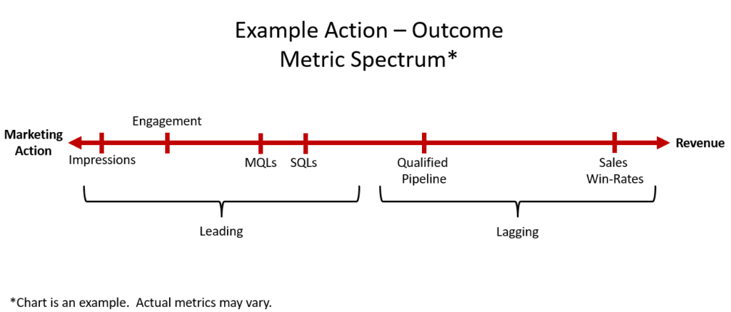 We break metrics into two categories: leading and lagging, but it is really more of a spectrum of how much time has elapsed since you took an action. The concept is pretty straightforward, but if you are unfamiliar, it looks something like this: