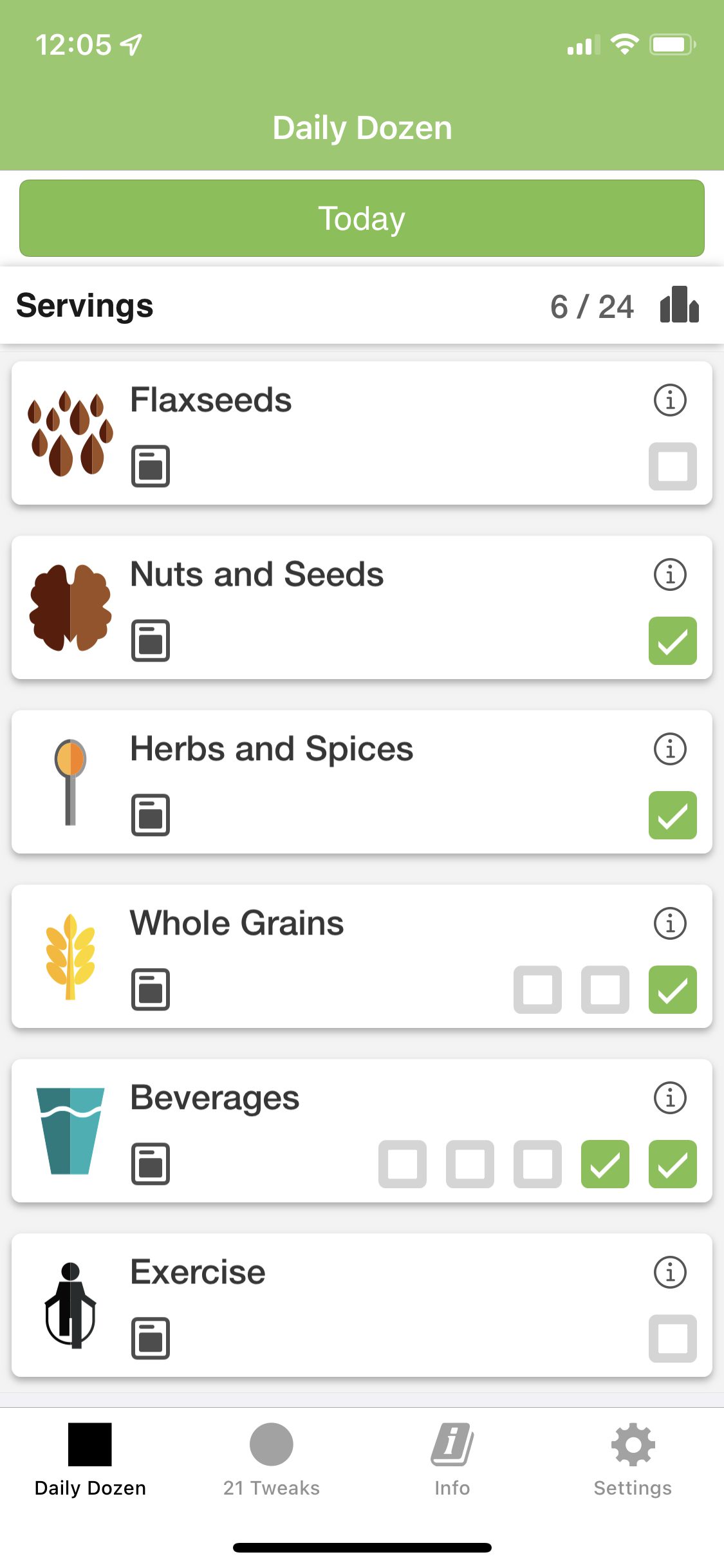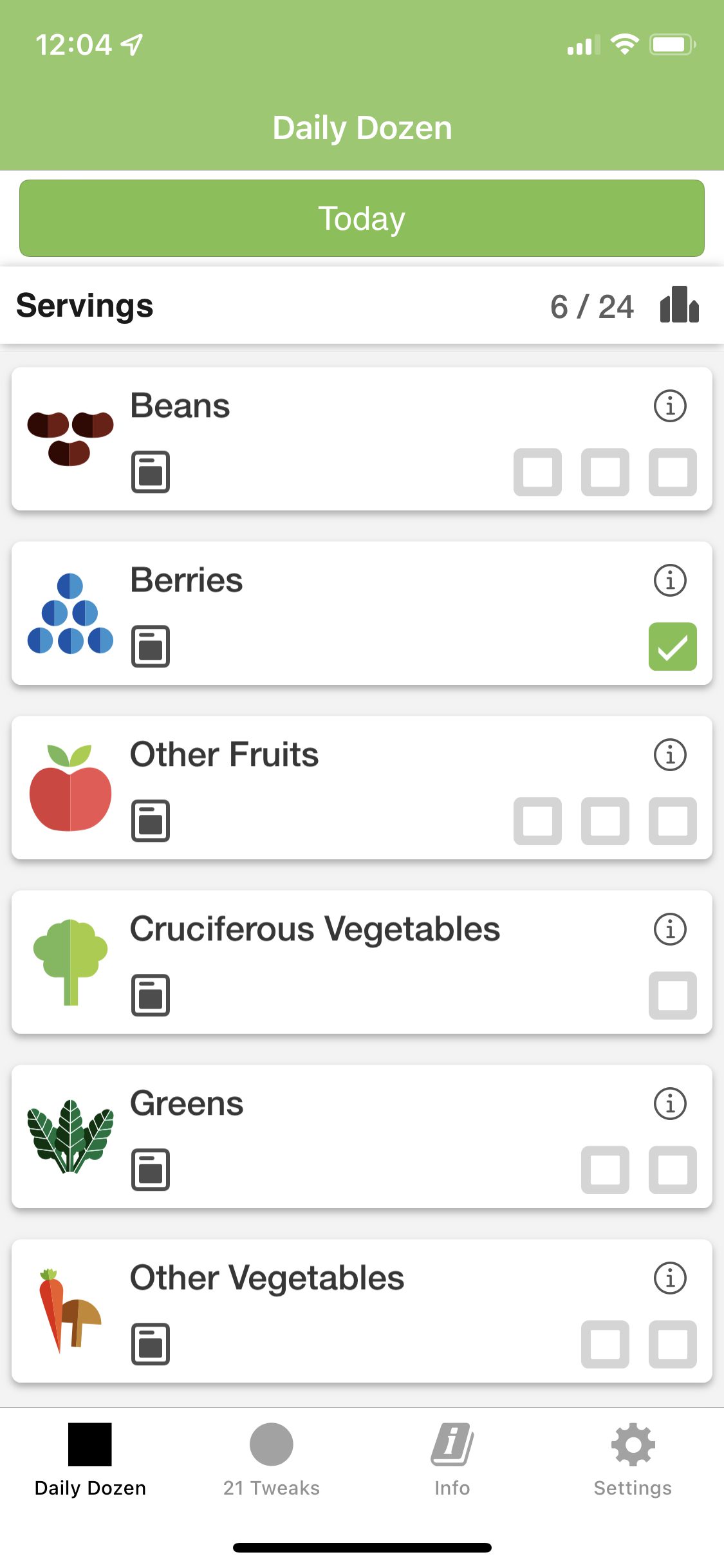 For example, right now, it’s noon and I’m only at 6/24 servings! I better get to work on incorporating beans, greens, other fruits, other vegetables, cruciferous vegetables, flaxseeds, and a couple more servings of whole grains into my day (plus exercise and more servings of healthy beverages).