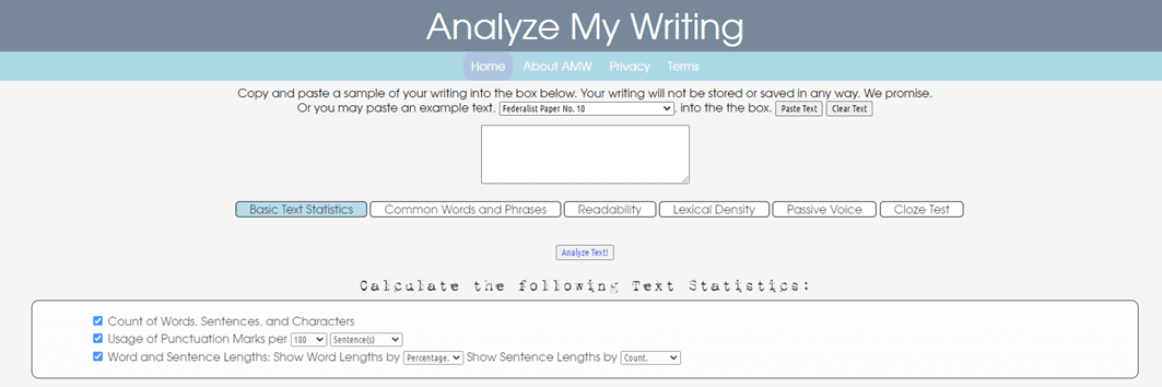 Copy and paste a text into the homepage and gain a wealth of information about your text including word and character counts, word and sentence lengths,