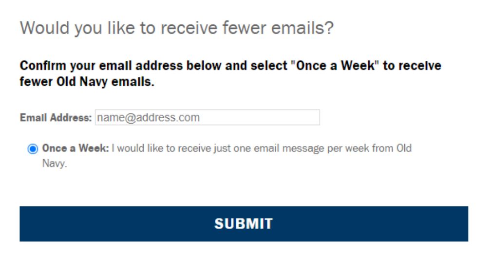 You might have a time-based preference center if you send out regular emails daily or multiple times per week and they don’t vary in content types. This might be more geared towards B2C type communications. I get a sale email from Old Navy almost daily and it drives me crazy!